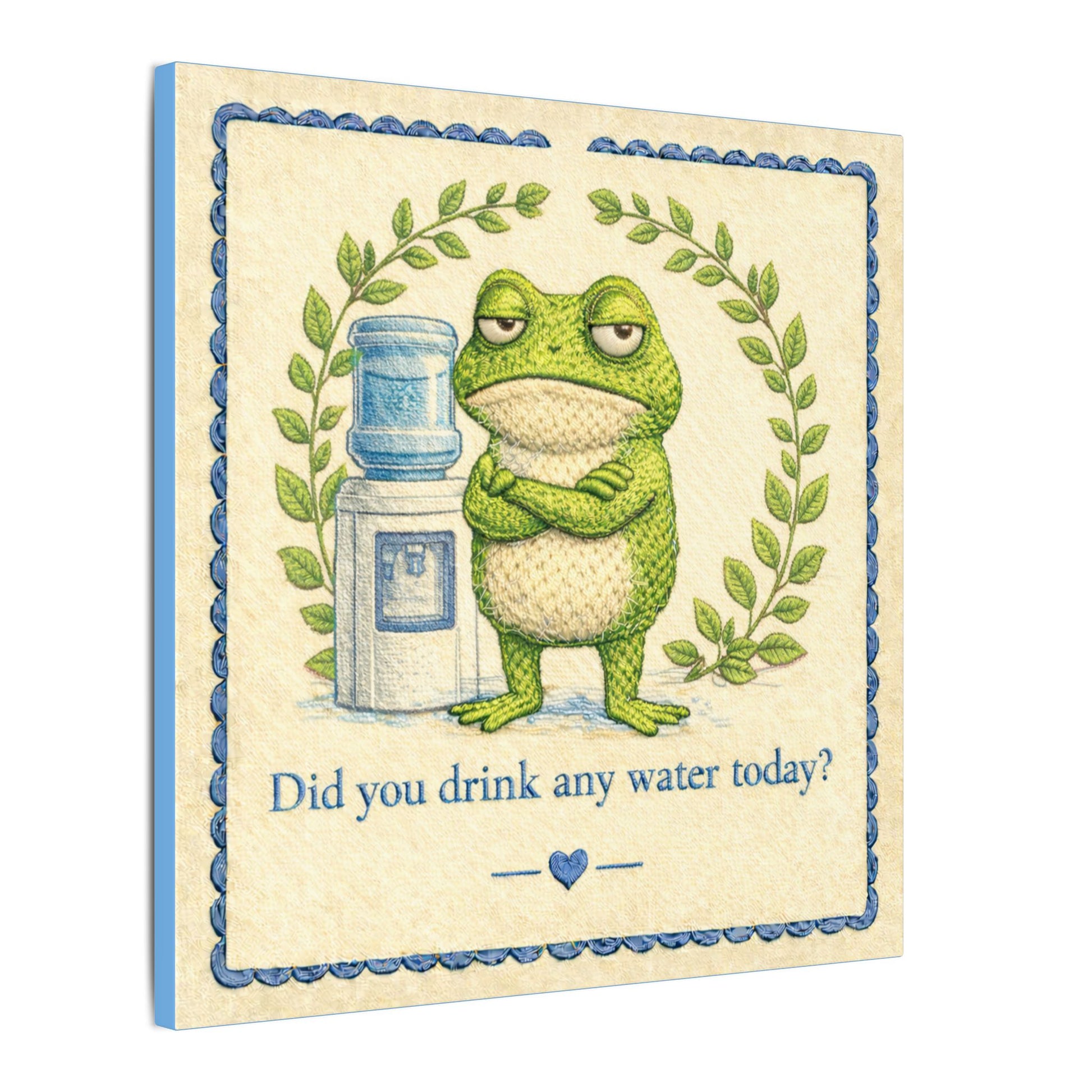 Stay hydrated with a side of sass! A grumpy frog with crossed arms stands judgmentally by a water cooler, surrounded by leafy greenery in charming stitched-embroidery style on soft cream. The mildly passive-aggressive reminder is funny, effective, and impossible to ignore.