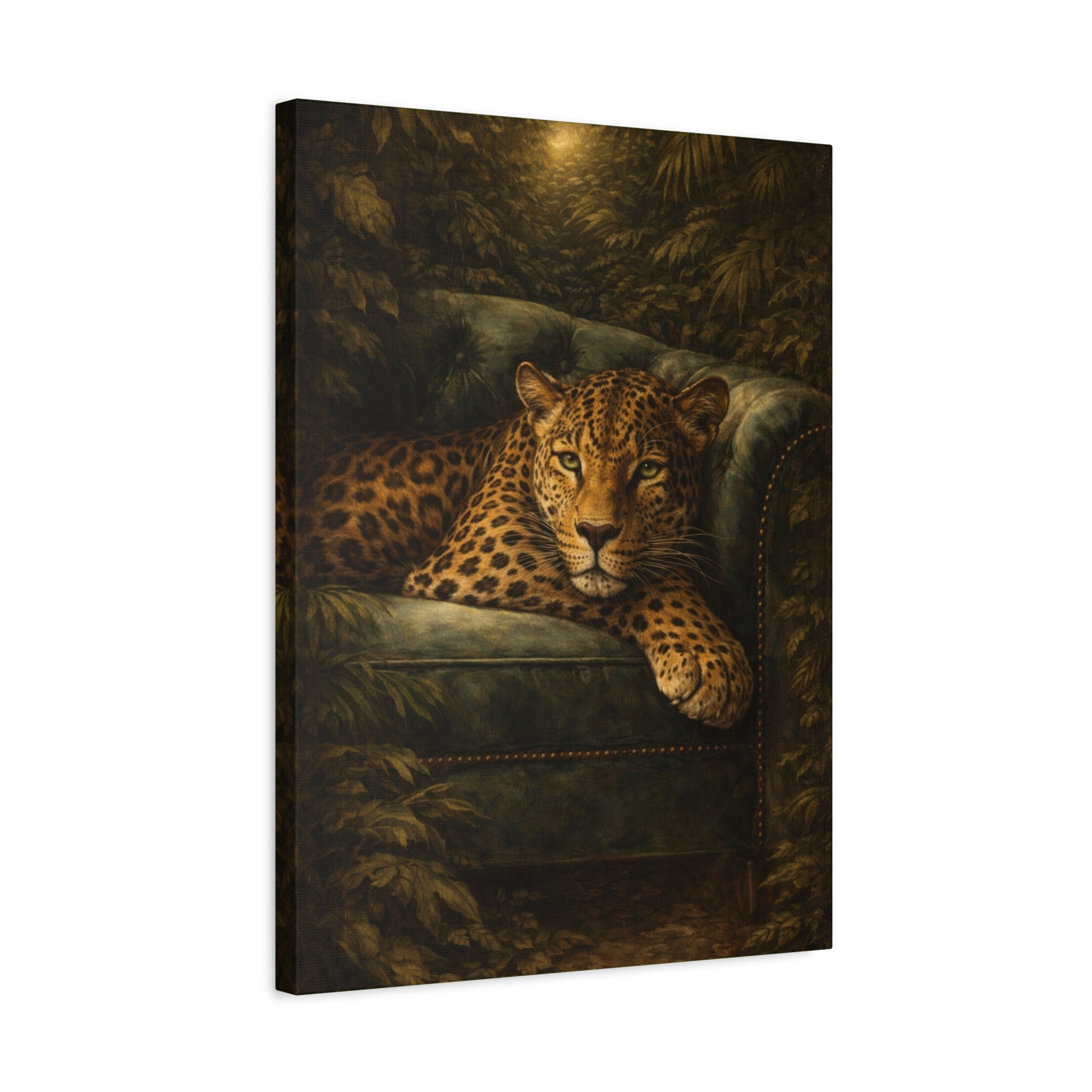 Get wild with this moody masterpiece! A sleek leopard lounges on a vintage sofa, half-hidden in shadows and emerald foliage, bringing untamed elegance to your space. The matte canvas finish deepens rich blacks and greens for a sophisticated, gallery-quality look. Perfect for eclectic decorators who love layered textures and a touch of mystery. Hangs securely with included hardware and protective rubber feet.